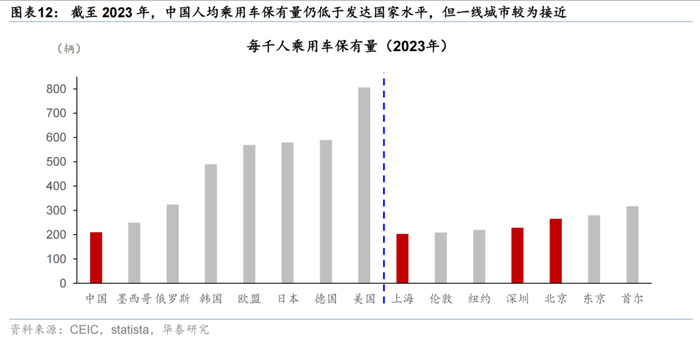 中国城市更新仍有较大空间,服务设施也仍有扩容潜力。目前中国人均铁路公里数仅为欧美国家约2成;2024年中国人均机场数约为欧美国家1/10。中国100万以上城市人口占比/人均住房面积亦明显低于发达国家。休闲设施之外,医疗养老、教育等设施较发达国家仍有5成增长潜力。我国每万人床位数量仅为日本/德国的4/6成。人均大学师资力量约为美国6成,人均图书馆/体育场数量也仍偏低。
