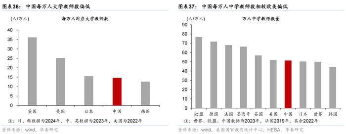 我国教育业整体发展水平仍有待进一步提升,虽然近年来我国中学、大学就读率不断提升,但从国际对比来看,中学、大学师资等配套仍有不足。2023年,我国每万人对应14.6个大学教师,仅占同期英国和美国的4成、6成;每万人中学教师数51.4个,为欧盟的七成左右。人均师资力量相较全球其他发达国家有一定差距,或可配套教学设施持续加大投入。
