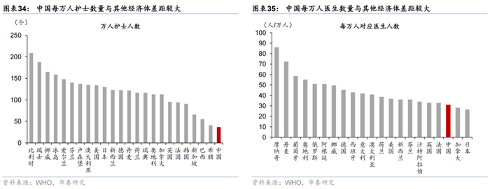 医疗设施方面,我国每百万人医院数量、每万人拥有床位数量亦较其他发达国家偏低,截至2024年我国每百万人医院数量仅为日本的4成,德国的7成,每万人床位数量仅为日本的4成,德国的6成。医生与护理人员配置方面亦有所不足,每万人医生/护士人数31.1/36.7人,每万人医生人数仅占俄罗斯、德国、美国的6~8成,每万人护士人数仅占澳大利亚、美国、日本、德国和韩国等国家的2~3成,对我国医疗、护理、康养等消费能力提升形成制约。