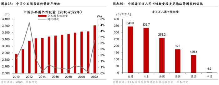 2010-2022年,我国公共图书馆数量呈现持续增长态势,总量复合增长率1.14%,2022年同比增速显著回升至2.7%,或部分受益于近年来“全民阅读”推广、公共文化服务体系完善等政策支持力度持续加大。但从国际对比的角度来看,我国每百万人图书馆数量较美国、英国等发达国家仍偏低,根据国际图书馆协会和机构联合会,中国每百万人拥有图书馆数量为4.3个,明显低于美国/日本的343/333个,落后于德国(129.4个)和英国(173个),或显示我国图书馆资源分布存在人均短板,可能受限于人口基数庞大与区域发展不均衡。