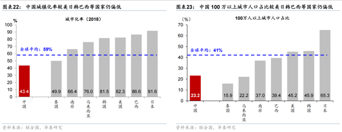 我国大城市人口集中度低于全球平均水平,尤其是城市更新、公共服务、文旅设施、商业发展等行业仍有广阔的空间。具体而言,截至2018年底,中国城市化率仅为43.4%,低于全球平均水平59%,亦明显低于美国、日本、韩国等发达经济体80%-95%的水平。从100万以上城市人口占比来看,中国大城市人口集中度相对较低。中国100万以上城市人口占比于2017年末录得23.2%,远低于国际平均水平41%,同期美国/韩国/日本录得45.2%/45.9%/65.3%(图表22-23)。