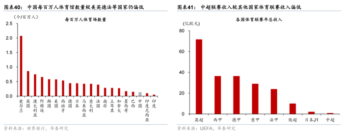 根据国家体育总局,2018-2024年,我国体育场地数量、体育场面积和人均体育场面积逐年增长,体育场地数量从2018年的316.2万个增加至2024年的484.2万个,人均体育场面积由1.9平方米增长至3.0平方米,2024年同比增速达3.8%,或反映国家政策对公共体育空间的持续投入。但从国际对比的角度来看,相较于美国、英国等发达国家,我国每百万人体育馆数量仍处于偏低水平,根据世界银行数据,我国每百万人体育场数量为0.12个,低于英国/美国的0.86/0.58个,与日本相差0.32个。