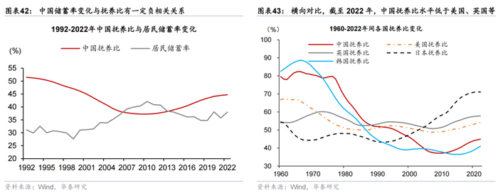中国抚养比水平提升或在2010年后推动储蓄率趋势性回落,但横向对比发达国家抚养比水平相对偏低。中国的独生子女政策和较早的退休年龄对居民储蓄率自1990年代初以来持续的提升有较大的影响。中国的抚养比从70年代末开始大幅回落,直至2010年才转而上升,可能与计划生育等政策因素有关。1980年中国开始实行独生子女政策,导致中国新生人口数量递减,进而在较短时间内迅速降低了少儿抚养比。此后中国的老龄化人口不断上升,人口抚养比上升。抚养比的变化亦会影响中国储蓄率的变化,从2001-2021年中国抚养比和储蓄率的变化来看,抚养比先降后升,居民储蓄率先升后降,均在2010年出现转折。该变化符合生命周期假说,年轻时收入低倾向于负储蓄,中年时是高收入和高储蓄,年老时是低收入和负储蓄,因此当抚养比越高,即年轻和老年人群占比越高时,居民储蓄率越低。