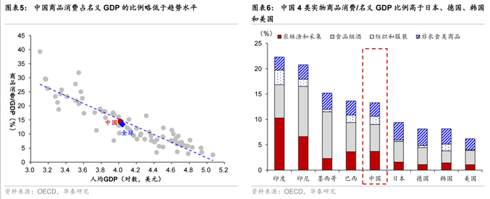 从居民消费支出结构上来看,中国服务消费占比弱于其他主要经济体,而商品消费/名义GDP比例较其他发达国家相对偏高。通常来说,实物商品消费占GDP比例与人均GDP水平呈负相关关系——随着经济发展、居民收入水平不断提升,人均GDP达到1万亿美元后,居民消费将会从实物商品向提供情绪价值的服务消费品转变、服务消费品的弹性更大。中国商品消费占GDP的比例和全球平均水平总体相当。根据OECD公布的2020年跨国投入产出表的国内最终消费需求数据,中国商品消费占GDP的比重约为13%,在总量占比与结构上均与巴西相近,而低于印度、印尼的20%,但相较日德韩美等发达国家不到10%的比例仍偏高。