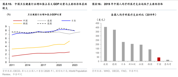 卫生健康行业增加值在2022年仅为2.6%,与美日韩英5.3%-8%的水平差距较为明显,仅为韩国约一半、日美英的约三成。这一差距不仅源于医疗体系差异,更反映出中国养老服务体系、健康管理机制以及预防保健体系的完善程度有待加强。居家养老、社区护理等服务供给不足,制约了相关消费能力的释放。以口腔医疗为例,2019年中国人均牙科医疗支出仅为美国的十分之一,亦显著低于德国、日本等发达国家,显示出基础医疗服务消费存在较大提升空间。