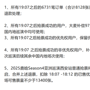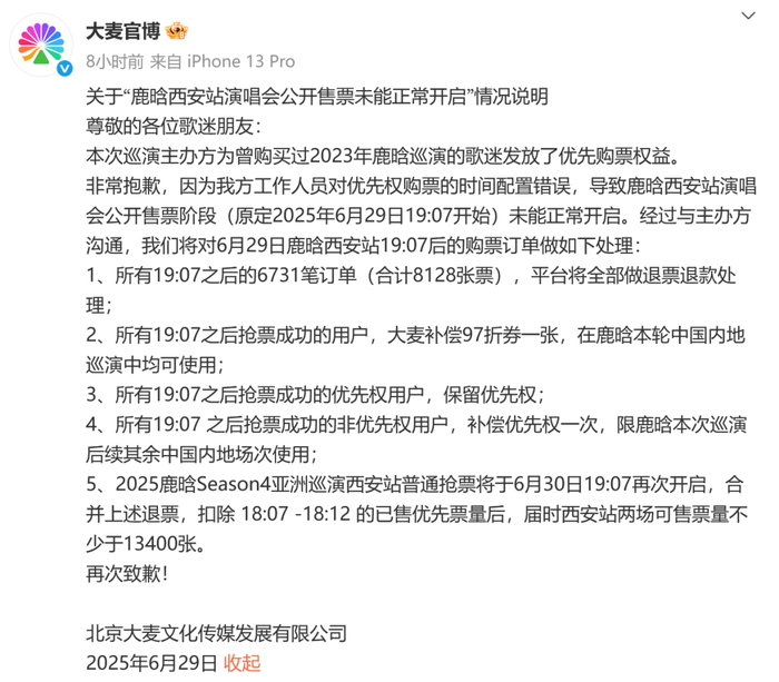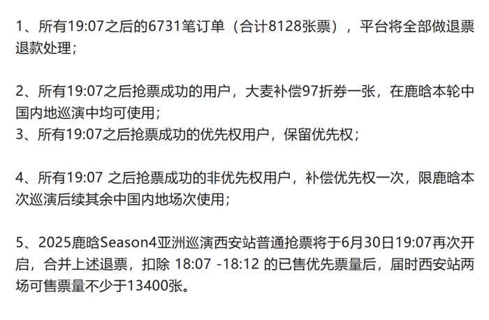 对此,大麦官博发布《关于“鹿晗西安站演唱会公开售票未能正常开启”情况说明》,表示将对6月29日鹿晗西安站19:07后的购票订单做如下处理: