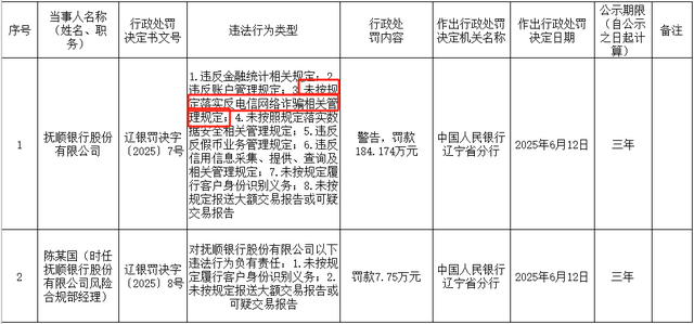 其中,抚顺银行因“未按规定落实反电信网络诈骗相关管理规定”等8项违法行为,被警告,并被罚款184.174万元。
