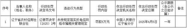 6月11日,中国人民银行辽宁省分行发布的行政处罚信息显示,辽宁省农村信用社联合社因“未按规定落实反电信网络诈骗相关管理规定”,被罚款5万元。