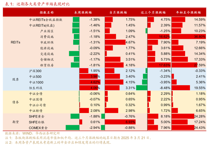 大类资产角度,本周REITs全线收跌,而权益市场(沪深300、中证500、中证1000、恒生科技)和转债均迎来上涨,黄金(沪金、COMAX黄金)表现不佳。
