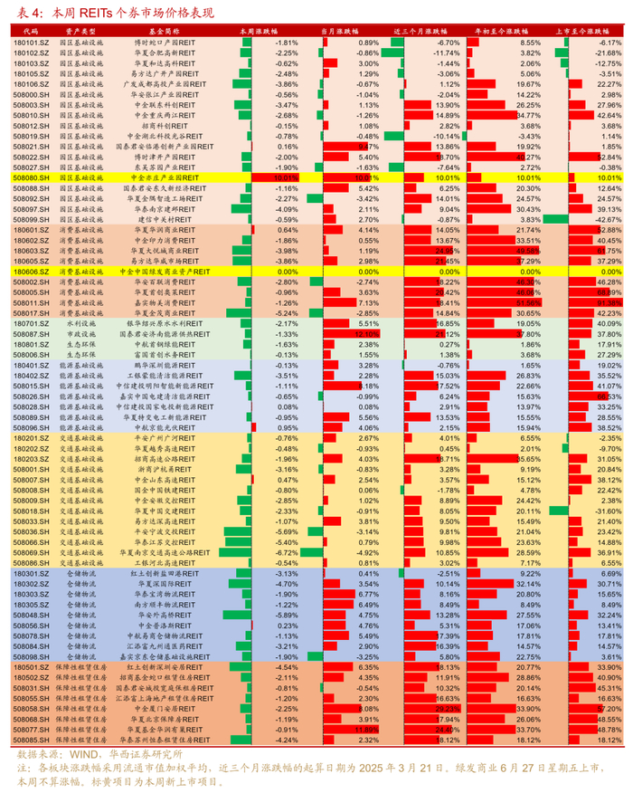 个券层面,分别于2025年6月26日、27日正式上市交易的中金亦庄产业园REIT、中金中国绿发商业REIT首日涨幅均达30%,亦庄产业园次日亦以10%涨停。本周价格上涨的其他REITs仅有国泰君安临港创新产业园REIT(0.16%)、华夏华润商业REIT(0.64%)、中信建投国家电投新能源REIT(0.08%)、中航京能光伏REIT(0.95%)、中金山东高速REIT(0.47%)和中金普洛斯REIT(0.23%),相关原始权益人均有很强的资产运营实力。