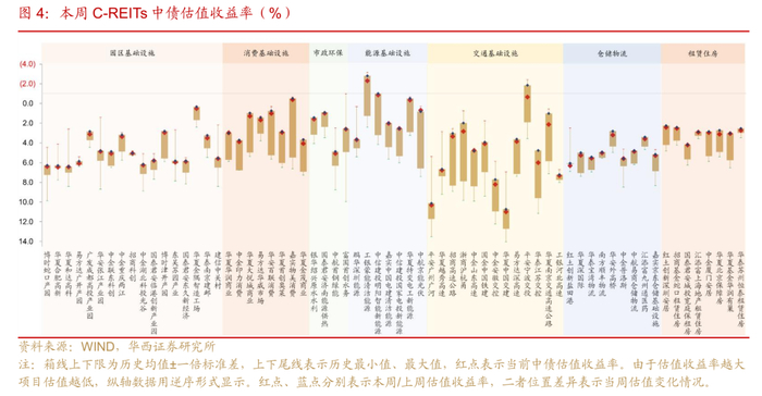 REITs全线下跌带来板块估值调整。从中债估值收益率来看,交通(5.38%)、仓储物流(4.96%)、产业园区(4.90%)板块靠前,项目估值表现分化较为明显,个券具有挖掘空间。