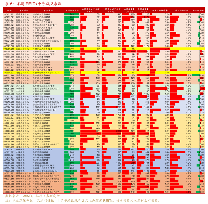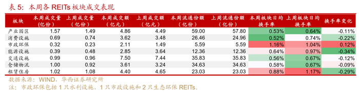 分板块来看,本周日均换手率靠前的分别是市政环保(1.16%)、租赁住房(0.88%)和能源设施(0.64%),其中市政环保近三周成交活跃度均领先其他板块,主要仍是国泰君安济南能源供热REIT成交依旧火热,日均换手率从1.6%上升至2.4%,富国首创水务REIT的成交也有所回暖。