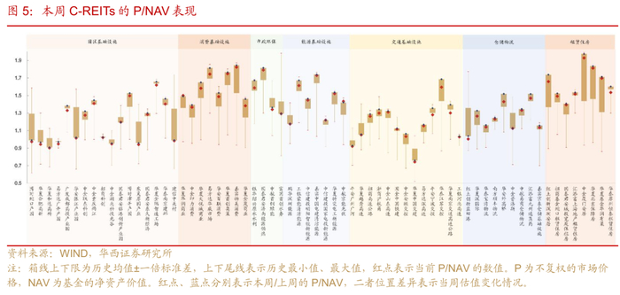 REITs全线下跌带来板块估值调整。从中债估值收益率来看,回调后各项目中债估值收益率均有所上升,交通(5.38%)、仓储物流(4.96%)、产业园区(4.90%)板块靠前,项目估值表现分化较为明显,个券具有挖掘空间。