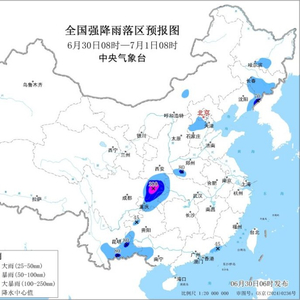 图1 全国强降雨落区预报图(6月30日08时-7月1日08时)