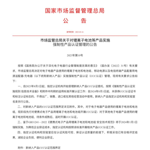 实际上,我国对充电宝产品的3C认证管理是从2023年8月才开始。国家市场监督管理总局于2023年3月14日发布的公告显示,“决定对电子电器产品使用的锂离子电池和电池组、移动电源以及电信终端产品配套用电源适配器/充电器(以下统称新纳入产品)实施强制性产品认证(CCC认证)管理”,要求“自2023年8月1日起,指定认证机构开始受理新纳入产品CCC认证委托” ,且“自2024年8月1日起,未获得CCC认证证书和标注认证标志的,不得出厂、销售、进口或在其他经营活动中使用”。