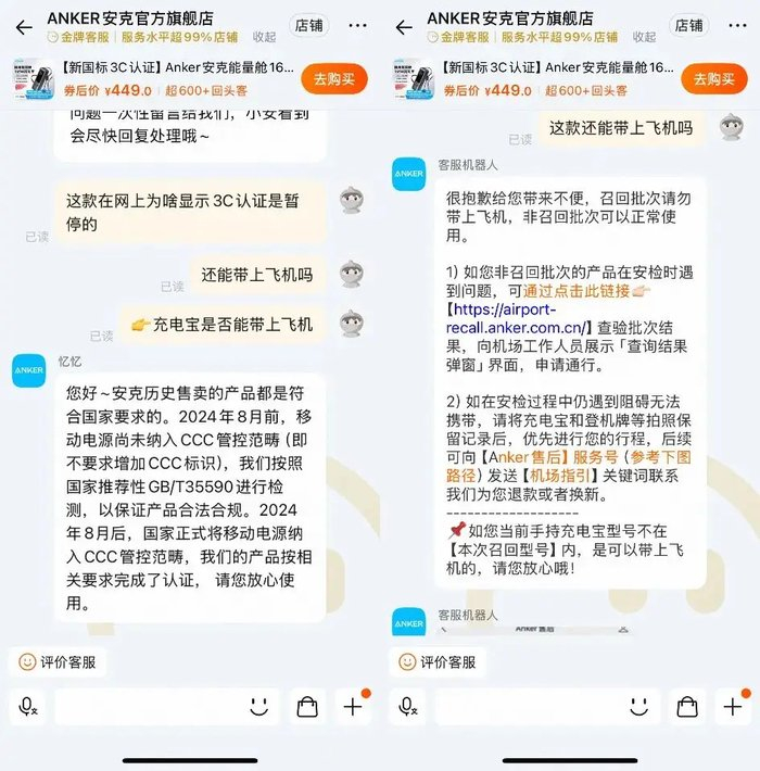针对这一问题,安克官方旗舰店客服回复称,如果产品型号不在“召回名单”内,消费者仍然可以正常使用并带上飞机,“安克历史售卖的产品都符合国家要求,2024年8月前,移动电源尚未纳入CCC管控范畴(即不要求增加CCC标识),我们按照国家推荐性标准 GB/T35590进行检测,以保证产品合法合规。2024年8月后,国家正式将移动电源纳入CCC管控范畴,我们的产品按相关要求完成了认证。”
