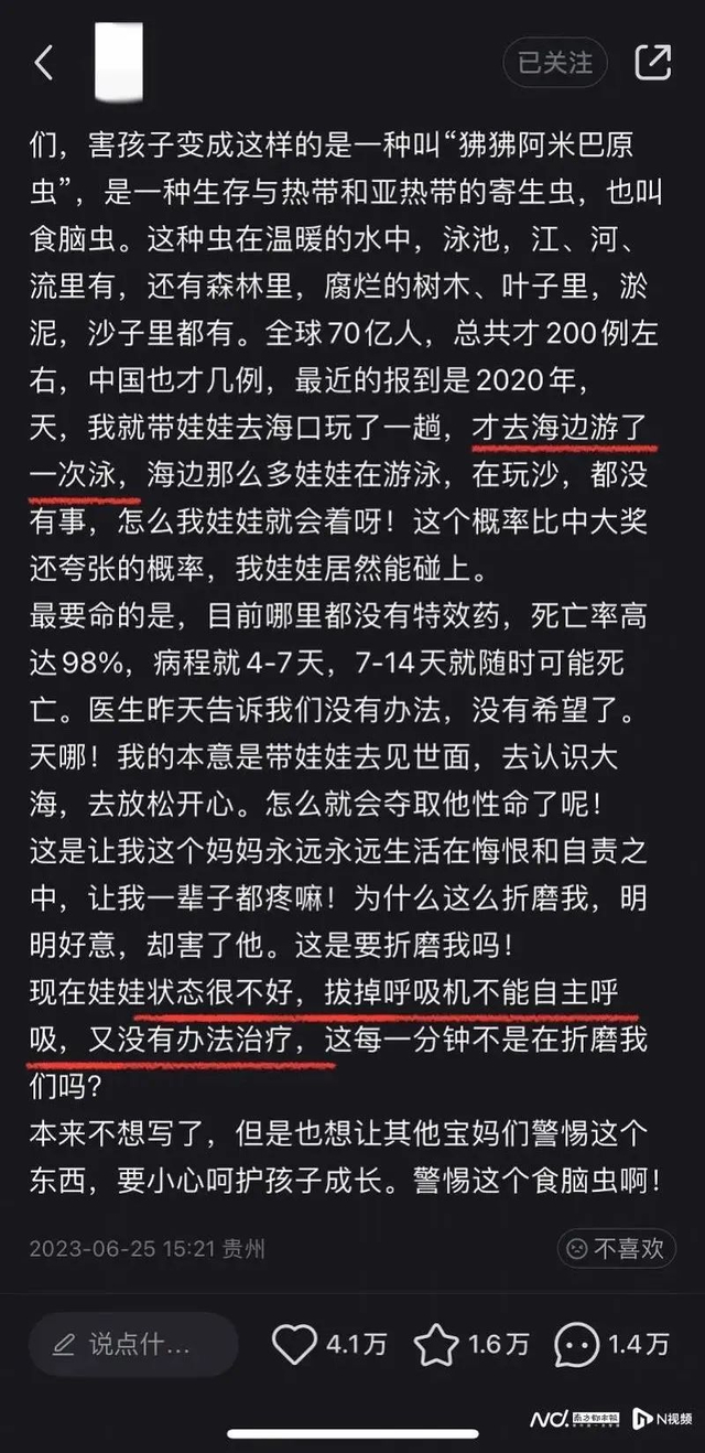 无独有偶,2023年6月,贵州一名孩子家长在网上持续记录自己孩子生病就医的经历。据说孩子去海边游了一次泳,竟感染了罕见的“阿米巴原虫”,俗称“食脑虫”。最要命的是,这个病目前没有特效药,死亡极高,堪称“超级杀手”。