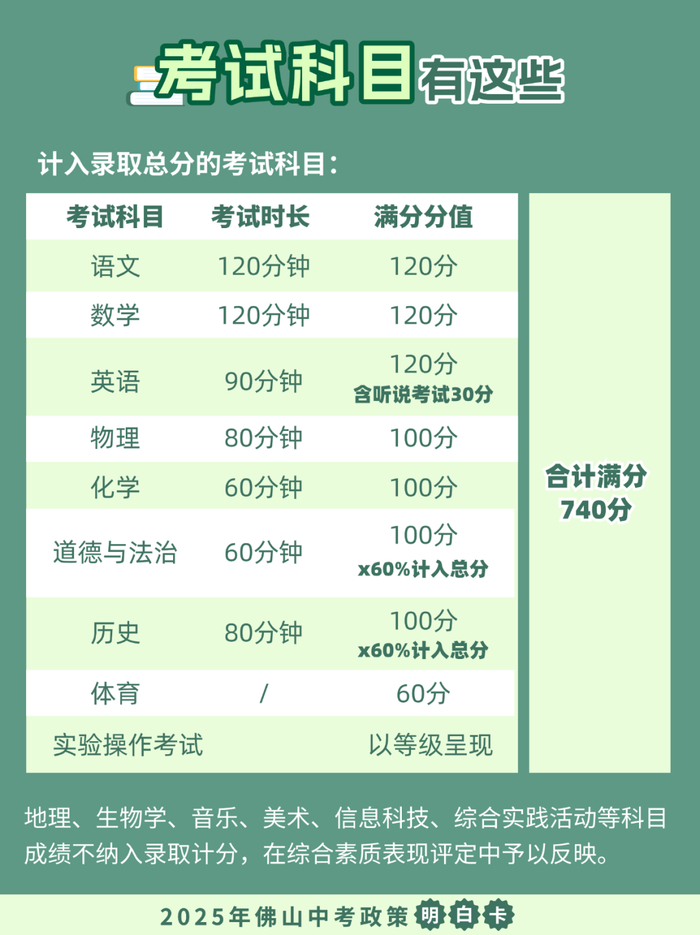 中考总分740 分,其中语文、数学、英语三科卷面满分各120分计入总分(英语科不考听力部分,另设听说考试);物理、化学两科卷面满分各100分计入总分;道德与法治、历史两科卷面满分各100分,各按卷面分值 60%折算计入中考总分(四舍五入取整数);体育科满分60 分计入总分,实验操作考试以等级呈现。
