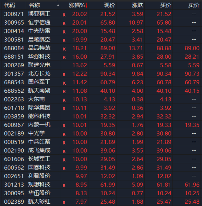 6月30日,军工概念股再度爆发,截至中午收盘,中光防雷、恒宇信通、博亚精工、晨曦航空、成飞集成、际华集团、中兵红箭、长城军工、中光学、国睿科技等近20只相关概念股涨停或涨超10%。