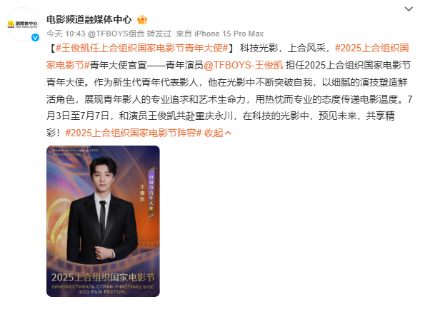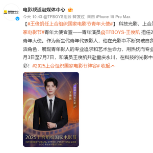 据@电影频道融媒体中心消息,青年演员TFBOYS-王俊凯 担任2025上合组织国家电影节青年大使。