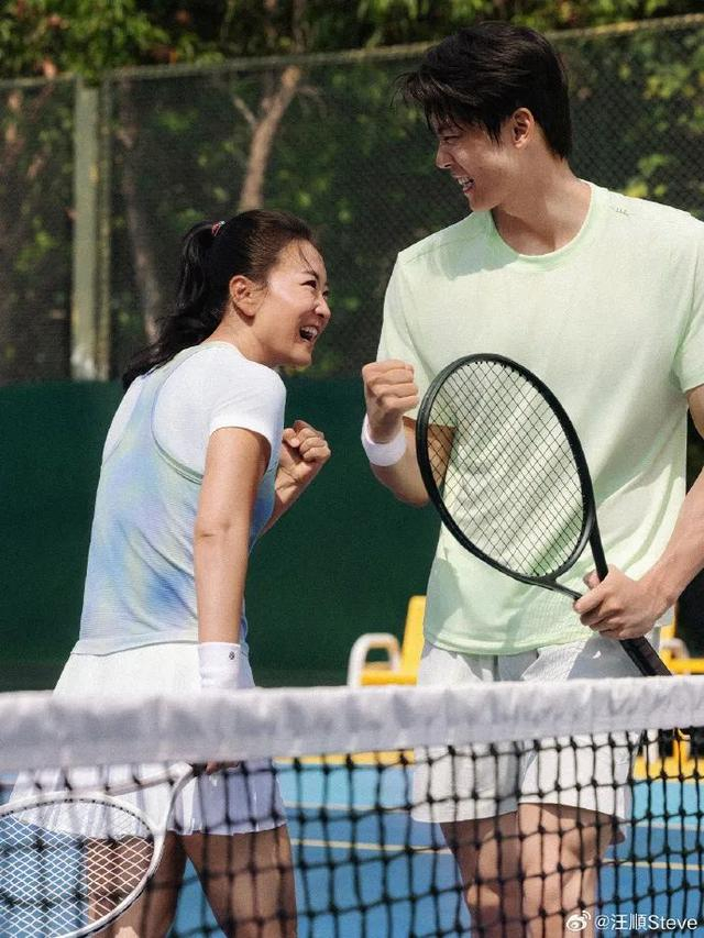 照片里,贾玲身着利落运动装,高扎马尾,活力四射,脸上洋溢着灿烂笑容;汪顺则一身专业网球装备,肌肉线条在阳光下若隐若现,帅气十足。