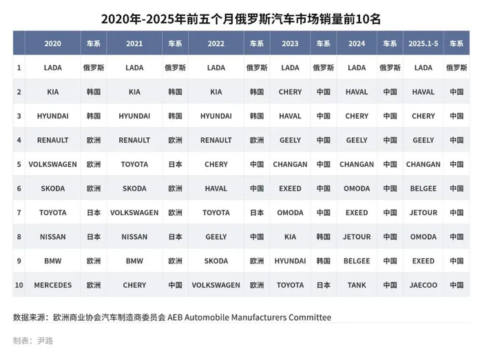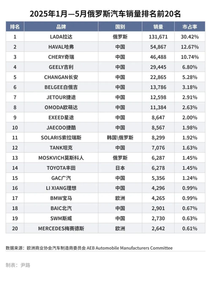 2022年的制裁并未造成市场格局剧烈波动,主要是因为中国汽车品牌的“精准填空”。2018 年,俄罗斯销量前20的品牌中仅有1个中国品牌;2022年增至4个;2023年跃升至10个;2024年达13个;2025年前五个月进一步增至14个。奇瑞、哈弗、吉利等品牌分别承接了大众、丰田、现代等退出后的市场份额,迅速完成了“西方退、中国补”市场生态位替代。