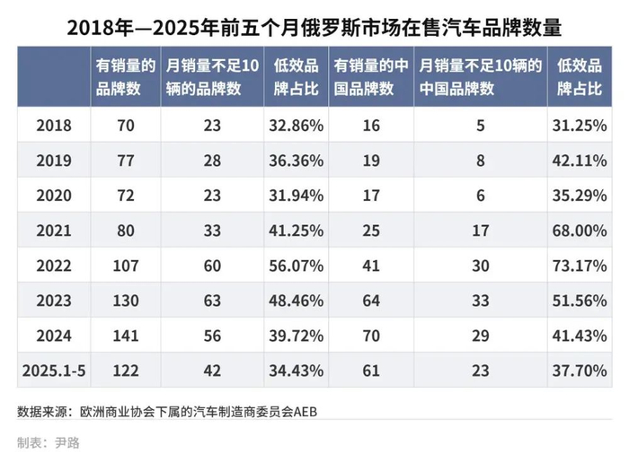 渠道的混乱最直接的影响就是单品牌效率低下。在俄销售的中国汽车品牌中,从2021年到2023年,过半品牌月销量不足十辆。2024年之后,低效品牌的数量开始减少,2024年减少了4个,2025年前五个月又减少6个。