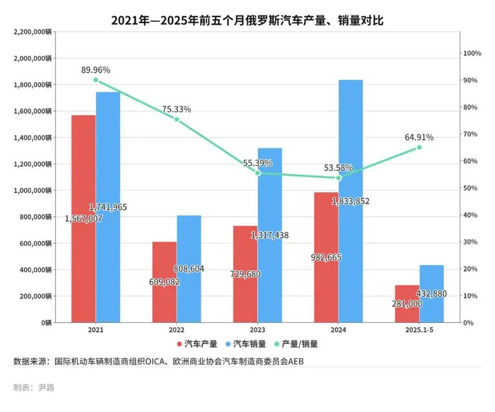 俄罗斯汽车市场的“异常”始于2022年西方制裁后的供应链断裂。2021年,俄罗斯汽车产量为1,567,007辆,销量为1,741,965辆,产量/销量比为89.96%,处于健康水平;2022年制裁后,产量骤降至609,082辆,销量也骤降到808,604辆,产量/销量比跌至75.33%;2023年—2024年,因为西方汽车品牌彻底退出,产量/销量比进一步下降至55.39%和53.58%,进口成为填补缺口的核心方式。