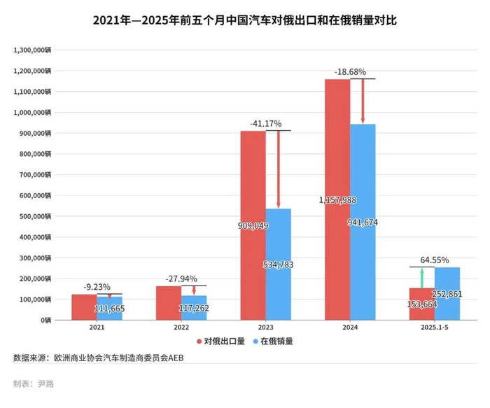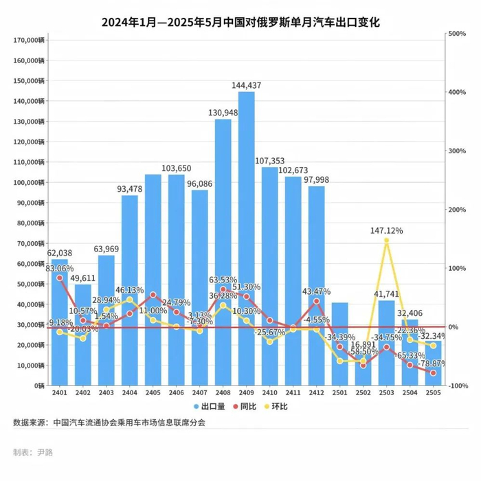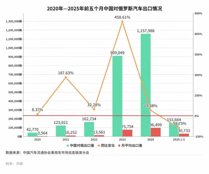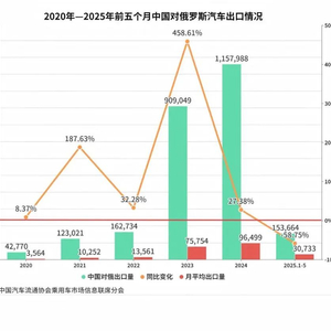 2025年1月至5月,中国对俄罗斯的汽车出口量出现了显著的下滑。根据中国汽车流通协会乘用车市场信息联席会(下称“乘联会”)数据,2025年1月至5月,中国对俄乘用车出口153,664辆,同比减少58.75%。