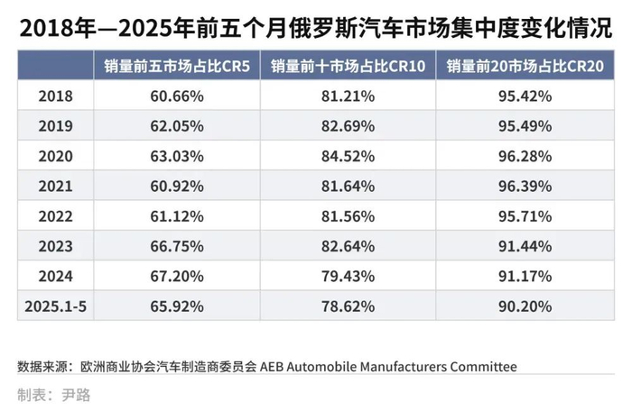 西方车企退出后,俄罗斯市场的集中度(CR)并未出现大幅波动。从2018年到2025年前五个月,俄罗斯汽车市场的CR5(市场份额前五名市场份额总和)一直在65%左右波动,最高和最低值的波动控制在7个百分点内;同期的CR10波动更小,不到6个百分点。