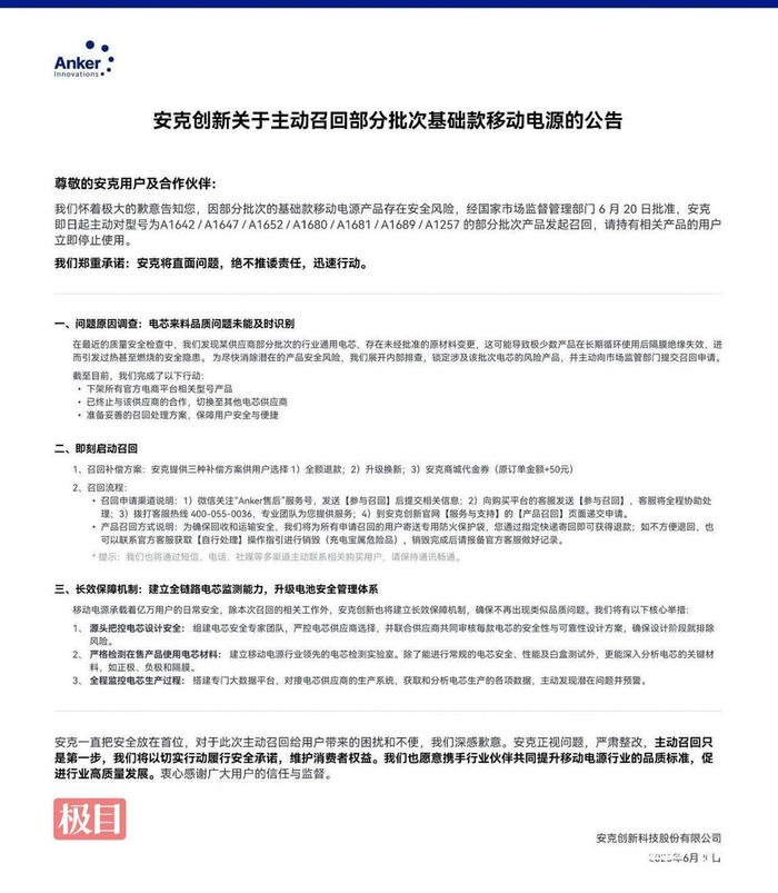 6月20日,安克创新发布公告,因部分批次基础款移动电源存在安全风险,经国家市场监督管理部门批准,即日起主动召回型号为A1642/A1647/A1652/A1680/A1681/A1689/A1257的部分批次产品。公告称,在最近的质量安全检查中,安克发现某供应商部分批次的行业通用电芯,存在未经批准的原材料变更,这可能导致极少数产品在长期循环使用后隔膜绝缘失效,进而引发过热甚至燃烧的安全隐患。安克创新在公告中表示,补偿方式上提供全额退款、升级换新、安克商城代金券(原订单金额+50元)等三种形式供用户选择。