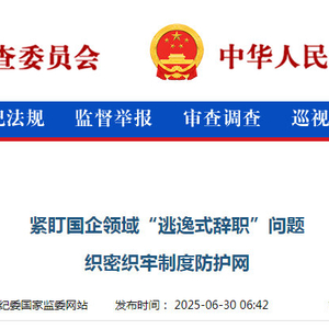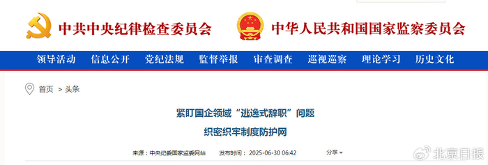6月30日,中纪委网站刊文:《紧盯国企领域“逃逸式辞职”问题 织密织牢制度防护网》。