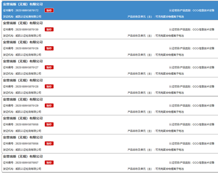 全国认证认可信息公共服务平台查询的信息显示,电池供应商安普瑞斯(无锡)有限公司的多个相关电池及电芯产品3C认证证书处于“暂停”状态。此外,罗马仕、安克创新、倍思、绿联等移动电源品牌的多个3C认证证书也被暂停。