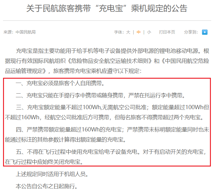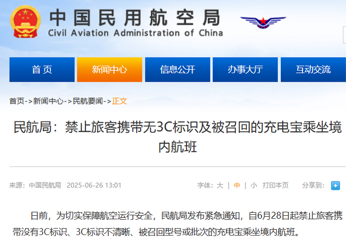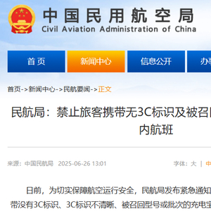 根据新规,无3C认证标识、3C标志不清晰、被召回型号或批次的充电宝乘坐境内航班。