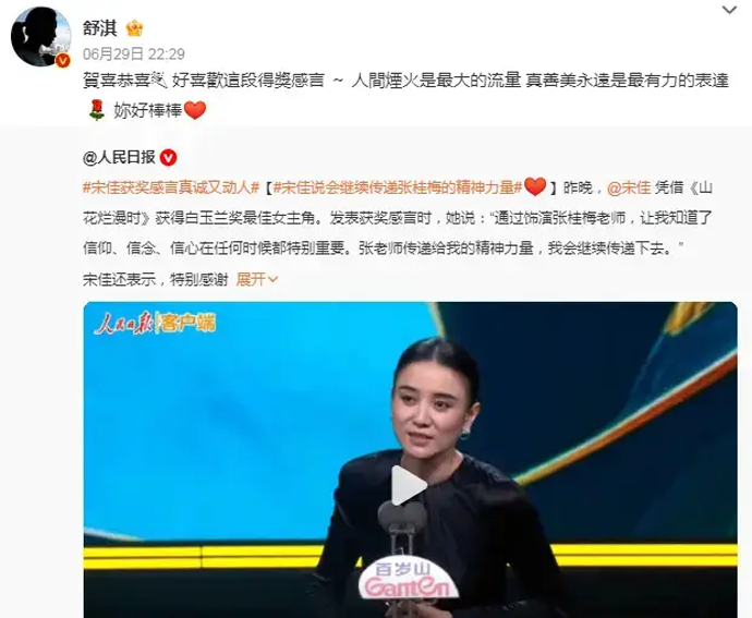 近日,宋佳凭借《山花烂漫》获得白玉兰最佳女演员,同为演员的舒淇在社交平台发文恭喜宋佳:“好喜欢这段得奖感言~人间烟火是最大的流量,真善美永远是最有力的表达。你好棒!”