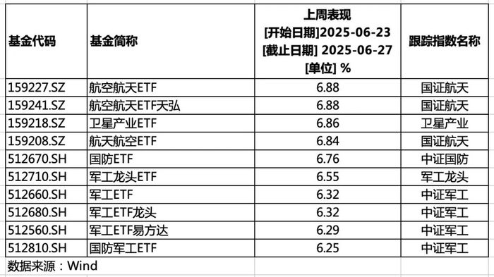 Wind统计显示,上周(6.23-6.27)区间,10只军工主题ETF涨超6%,跟踪指数合计5只,分别为:国证航天、卫星产业、中证国防、军工龙头、中证军工。