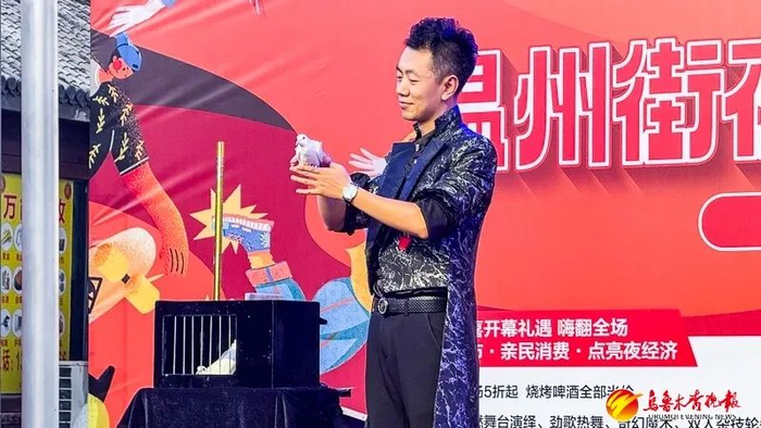 在温州街夜市的文化惠民活动中,演员正表演魔术。