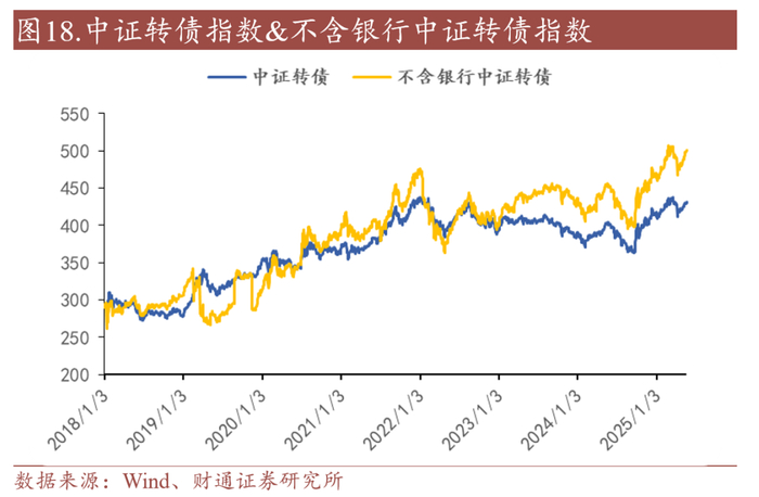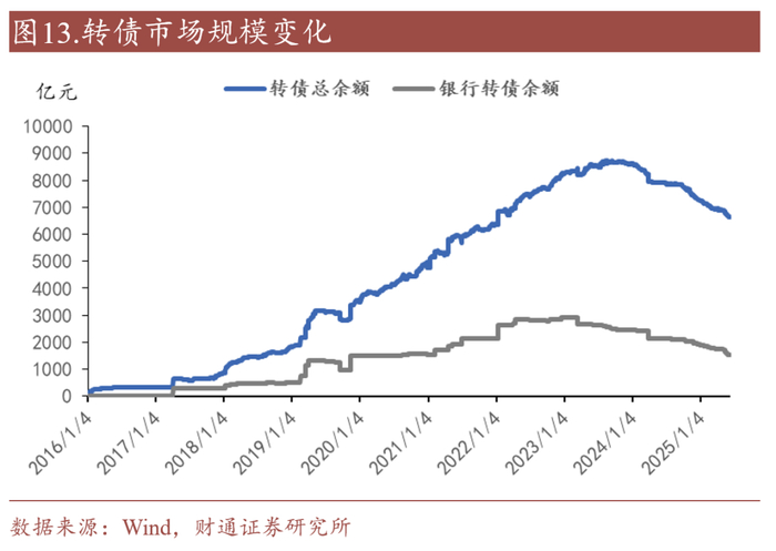 市场需求出现新变化。权益市场位置不低,下半年获取转债alpha的难度较上半年或更高。 此外,“固收+”投资者对低波标的诉求强于去年,尤其是高风险厌恶投资者“券荒”进一步加深。供需错位下,部分转债需求“离场”。以银行理财为例,上交所口径银行理财转债持有规模和银行转债规模变化基本同趋势。至2025年5月,银行理财持有上交所转债规模已达2022年以来最低水平。