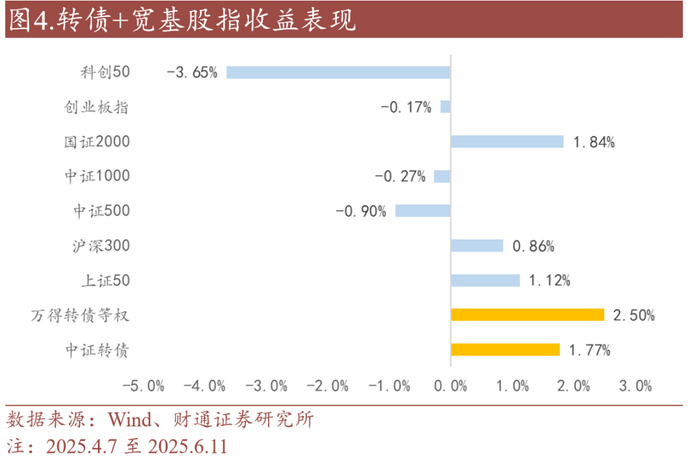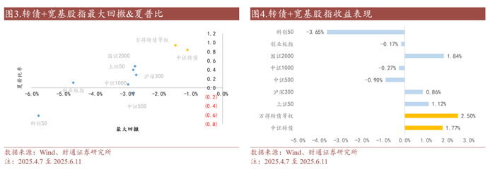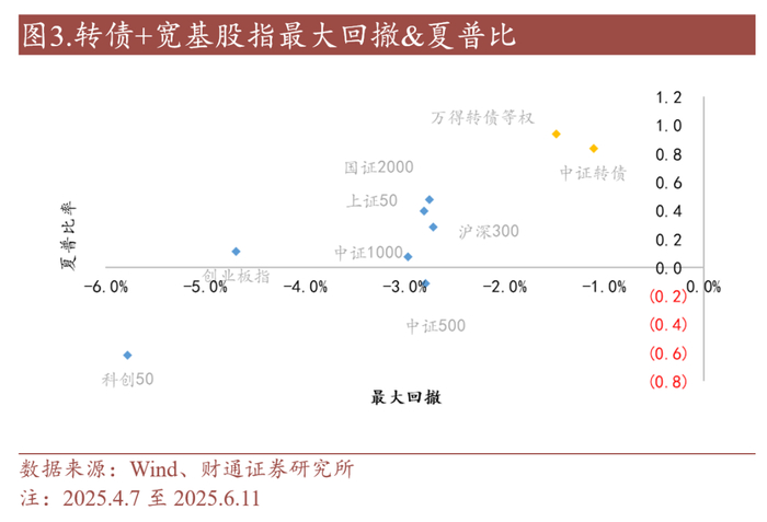 4月中美冲突以来转债表现强势,兼具稳定与强收益。2025年4月7日至6月11日,中证转债指数收涨1.77%,相较主流股指仅跑输国证2000。同时由于市场波动对转债估值的支撑与债底支撑兼具,转债在最大回撤与夏普比方面表现优异。我们预计随着宏观环境不确定性延续,转债内嵌期权,极具凸性的属性将更加难能可贵,积极看好2025年下半年转债资产的比价表现。