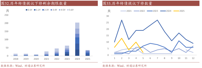 条款方面,2025年上半年转债提议下修频率虽不及2024年,但从剩余期限结构上来看,剩余期限3-4年的转债占比明显增加,主要或系2024年9月24日前发行人处于回售、减资清偿等压力被动下修,临期转债下修占比增加,2025年股市情绪修复,发行人主动化债意向较强,尤其发行在2022年后权益持续承压,剩余期限3年左右的公司更重视本轮权益周期化债。此外,由于新券供给受限,目前暂无次新券提议下修。