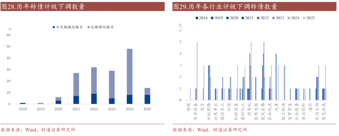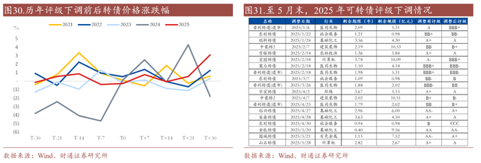 2025年评级调整影响有限,落地后或有增量资金博弈。2024年评级调整数量明显多增,叠加市场悲观情绪,去年评级下调对转债价格扰动显著高于往年,今年市场对评级关注度仍较高。2024年电力设备和汽车行业评级下调次数明显边际高增。截至2025年5月31日,2025年基础化工和计算机行业下调次数较多。剔除频繁下调评级的东时和中装转2,2025年目前共有10只转债下调评级。从目前评级调整前后净值走势来看,2025年评级下调对转债价格影响有限,主要系短期出库抛压,抛压过后存在回调,尤其对高评级转债影响更弱,原因或在于中高评级转债违约风险不大,评级结果落地后市场不确定性减弱,或有增量资金入场博弈。