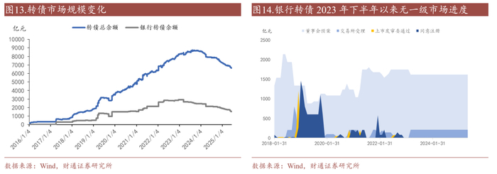 银行转债退出加速下半年转债市场缩量进程。2025年下半年浦发转债500亿元到期,同时杭银转债已经公告强赎,南银、齐鲁转债即将触发强赎,不考虑其他银行转债促转股规模,银行转债规模或从1500亿元水平快速降至900亿元,数量从10只减为6只。新银行转债上市尚需等待。目前一级市场有进度的银行转债共四只,除西安银行进度为股东大会通过外,其余三只进度均为交易所受理。2025年西安银行、瑞丰银行均做了转债发行决议效期的延长,但考虑到2022年末齐鲁银行上市后再无银行转债发行,后续银行转债发行的节奏很难做出预期。