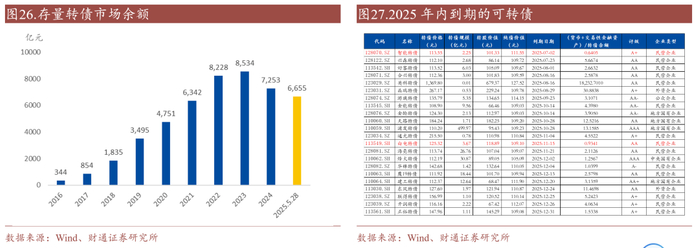 截至2025年6月3日,转债市场面值存量6657.76亿元,较2024年年末同比下降接近589亿元,市场规模回落至2022年年初水平。我们预计2025年下半年转债规模下降还将提速,市场规模或跌破6000亿元。
