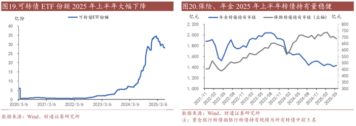上半年转债投资更倾向主动化。可转债ETF在2025年上半年份额下降近5亿份,规模回退至2024年10月末水平,扣除ETF基金持有转债规模则基本持平2024年末。“主动化”和上半年主动基金的优秀表现密不可分,截至5月30日,2025年万得可转债基指数相较中证转债指数超额收益0.6pct,即可转债基整体跑赢指数。除此之外,保险、年金等机构积极配置转债资产,其2025年上半年直接持有转债数量保持稳健。