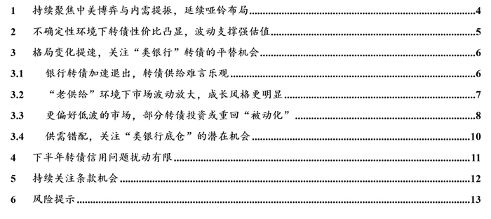 持续聚焦中美博弈与内需提振,建议延续哑铃布局。我们判断下半年中美博弈仍将为市场带来一定的不确定性,“科技突围+红利防御+内需修复”的哑铃配置仍是最优解。下半年权益市场的机会在于“防御中布局反击”——以红利资产应对中美博弈的不确定性,以科技与内需博弈政策催化的弹性,关注相关板块的转债,捕捉“进可攻、退可守”的结构性收益。