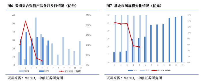截至2025年6月27日,2025年券商资管累计新发行份额200.41亿份,新成立基金1766只。2025年5月共计新发资管产品320只,同比+37.93%,共计市场份额33.41亿份,同比下降10.34%。截至2025年6月27日,基金市场份额29.68亿份,实现基金规模32.31亿元。