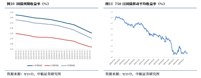 截至2025年6月27日,10年期债券到期收益率为1.6462%,环比+0.44BP。10年期国债750日移动平均值为2.2121%,环比-0.81BP。