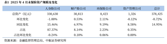 截至2025年4月,保险公司总资产为37.84万亿元,环比-0.72%,同比+14.95%。其中人身险公司总资产33.06万亿元,环比-1.00%,同比+15.46%,占总资产的比重为87.37%;财产险公司总资产3.08万亿元,环比+0.53%,同比+6.97%,占总资产的比重为8.14%。