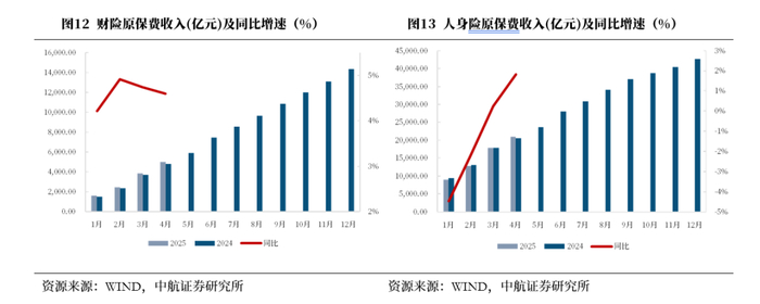 原保费收入: 2025年4月,全行业共实现原保险保费收入25,954.45亿元,同比+2.25%。其中,财产险业务原保险保费收入4,988.90亿元,同比+4.10%;人身险原保费收入20,965.56 亿元,同比+1.82%。