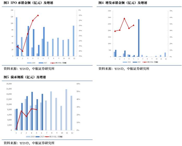 截至2025年6月27日,25年股权融资规模达10,321.00亿元。其中,IPO335亿元,增发4218亿元,其中,再融资5417亿元。2025年5月券商直接融资规模为167.95亿元,同比-22.56%,环比-54.62%。截至2025年6月27日,券商累计主承债券规模73177.68亿元。2025年5月债券承销规模达到12063.37亿元,同比+23.05%,环比-18.96%。
